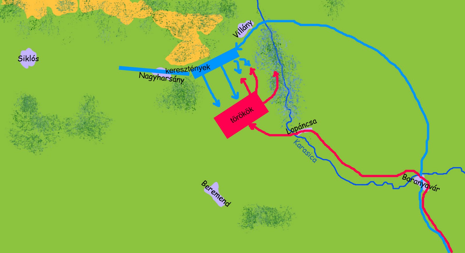 A továbbra is visszavonuló keresztény sereg megtámadása érdekében a török nagyvezír feladta Baranyavár környéki állásait is és továbbvonult, hogy aztán Lapáncsánál átkeljen a Karasica patakon. Míg a keresztény sereget kisebb támadásokkal zaklatta, azonnal nekilátott tábora és harcállásai megerődíttetésének. Lotharingiai Károly serege vele szemben, Nagyharsánynál, a Szársomlyó hegy lejtőjén állt hadrendbe. A keresztény sereg balszárnyát II. Miksa Emánuel választófejedelem vezette, elsősorban rájuk hárult a feladat, hogy visszaverjék az újabb és újabb török támadásokat. 1687. augusztus 12-ének déli órái főleg az elsáncolt (török) állások kiépítésével és az ellenfél „kóstolgatásával” teltek. Lotharingiai Károly, tekintve, hogy csapatai elég szerencsétlenül álltak fel – ugyanis a jobbszárnyat egy sűrű erdő választotta el a harcmezőtől, így nem tudott az összecsapásban hatékonyan részt venni –, a Siklós felé való visszavonulást fontolgatta. A balszárnyon küzdő Miksa Emánuel és Bádeni Lajos viszont éppen egy erőteljes támadás mellett kardoskodott. Lotharingiai Károly sürgősen haditanácsot hívott össze, melyen a többség a támadás mellett döntött, ezért ő is meghajolt akaratuk előtt.
